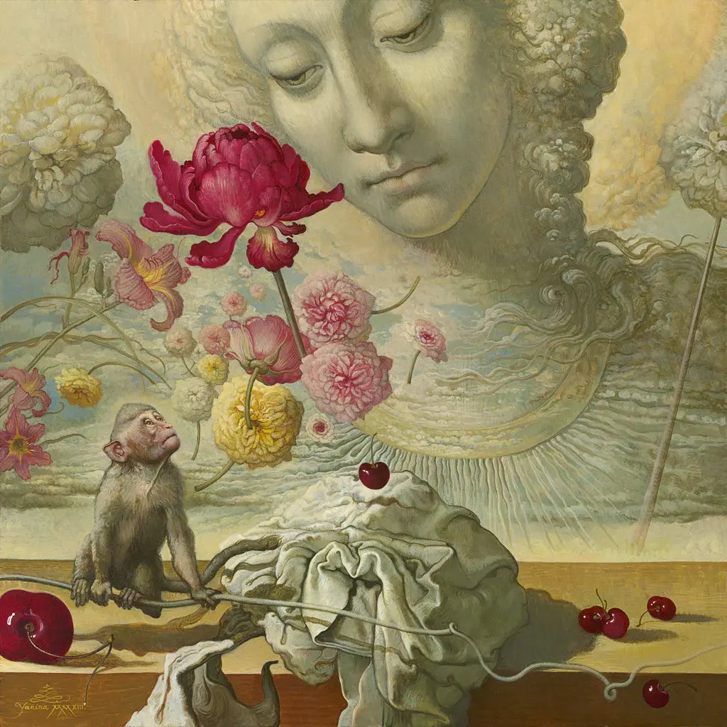 Yana Movchan Monkey Watching Dancing Flowers Greeting Card 7" x 5" double thick card stock.